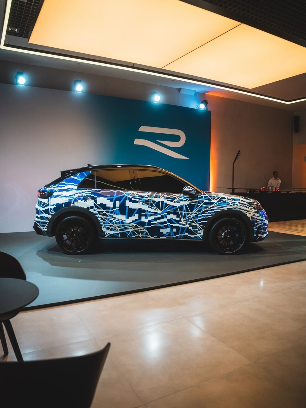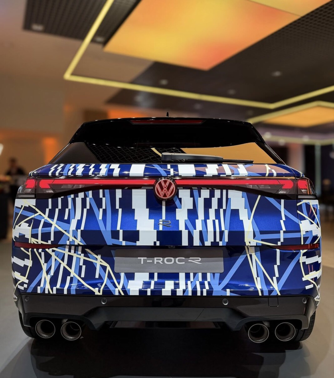 Авто приховане синьо-білим камуфляжем, але вже видно змінений обвіс, агресивні бампери та фірмову оптику. Прототип оснащений 20-дюймовими чорними дисками, синіми супортами та чотирма вихлопними насадками Akrapovič — головна ознака версії R. Дизайнер Андреас Міндт також поділився тизерними ескізами з більшим дифузором і фірмовим кольором Lapiz Blue.