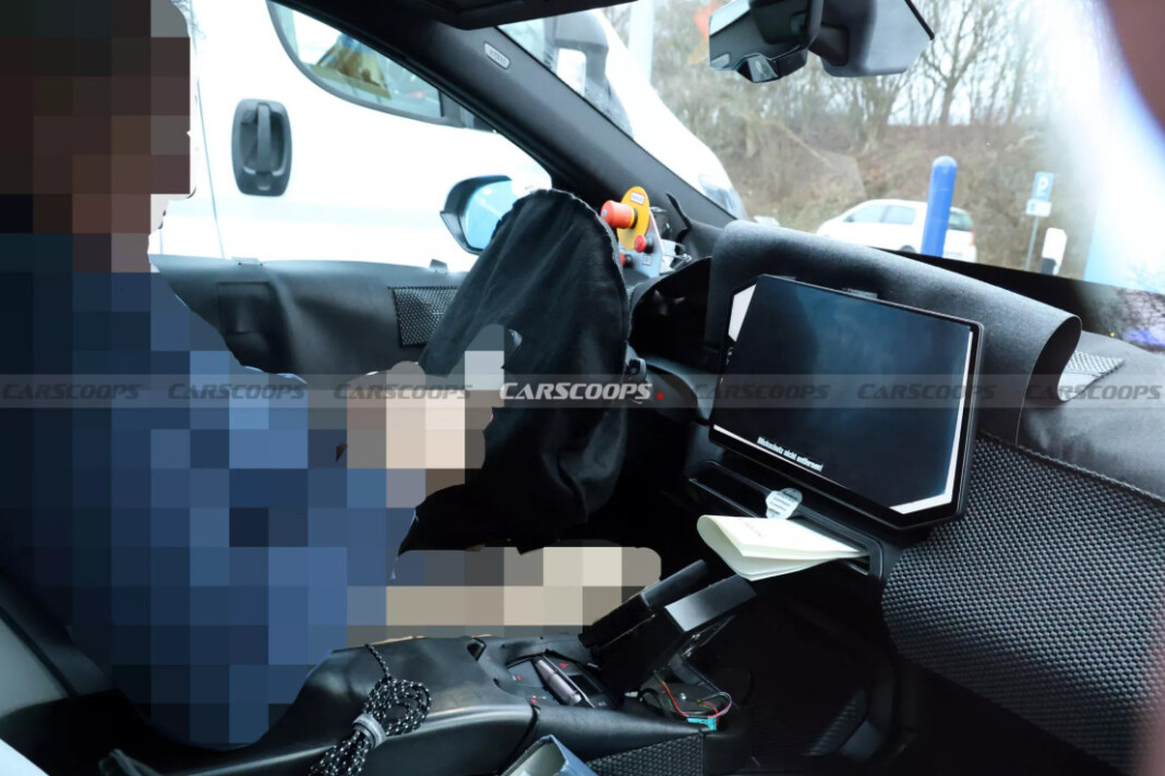 У салоні — Panoramic iDrive: дисплей від стійки до стійки в основі лобового скла плюс окремий великий екран (ймовірно, близько 17,9″). Центральна консоль і органи керування нагадують iX3, а на дзеркалі заднього виду помітна камера.