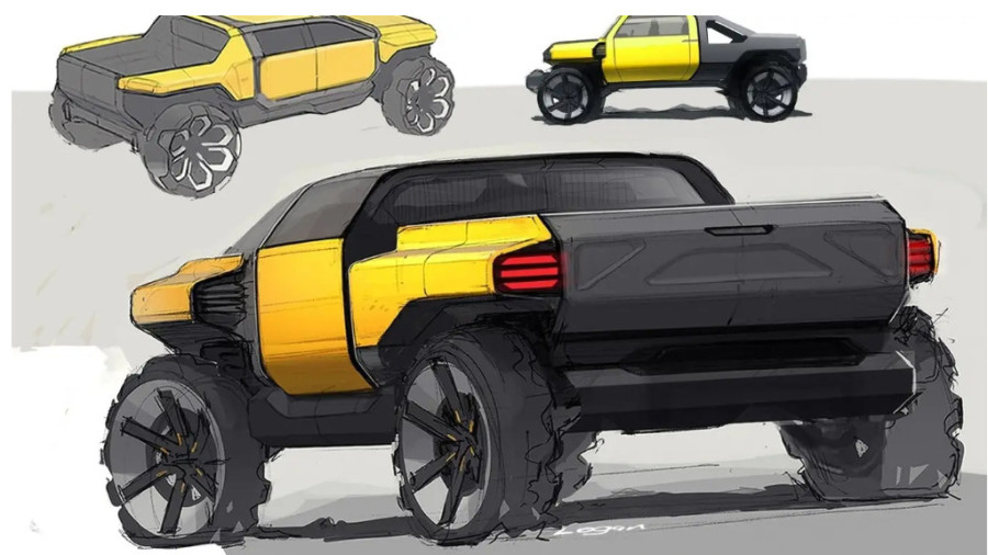 Інший ескіз, створений Девідом Акостою, демонструє синій пікап із модульною конструкцією та знімними дверима. За стилем він нагадує майбутній Chevrolet Colorado EV і, можливо, увійде до лінійки електричних пікапів GM, поряд із GMC Hummer EV та Silverado EV.