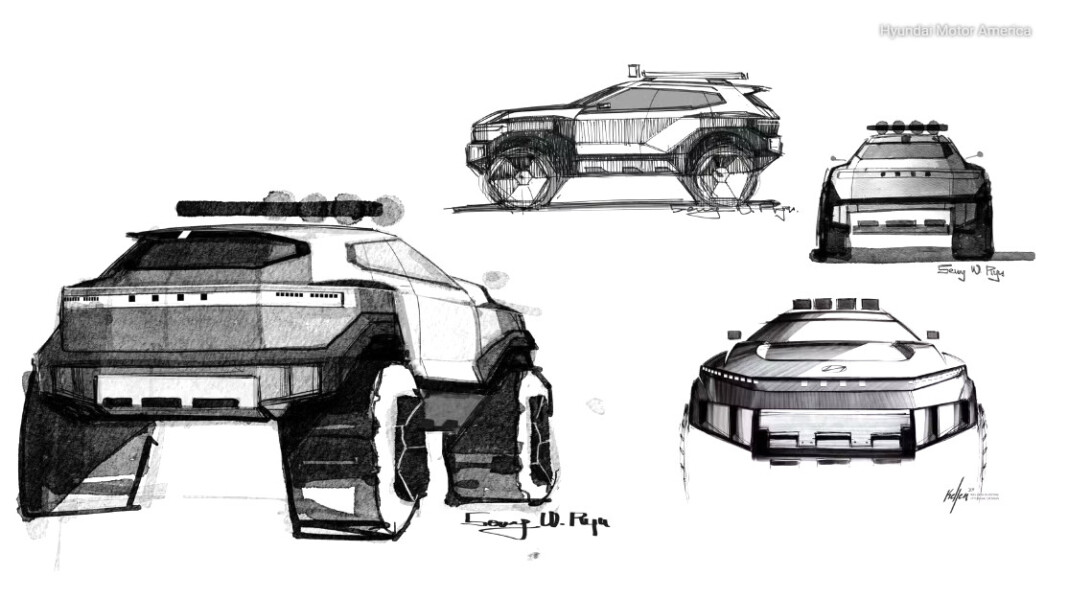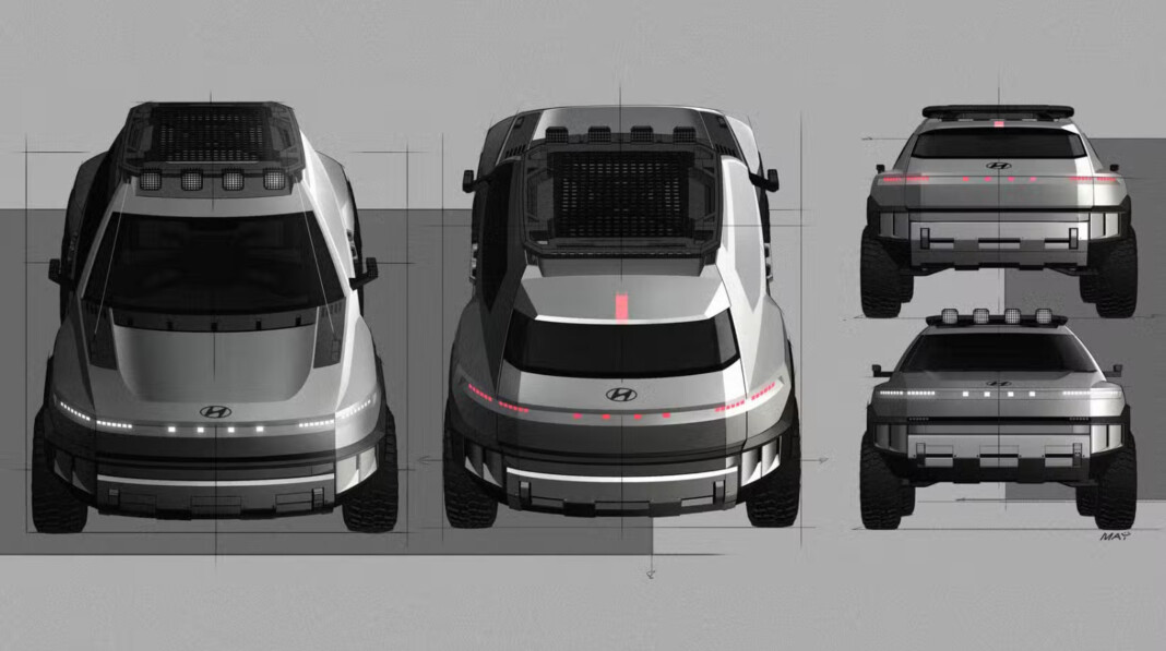 CRATER отримав брутальний, утилітарний дизайн: підняту підвіску, великі колеса, короткі звиси, а також фірмове піксельне світло Hyundai. Бокові розширені арки та масивний даховий багажник з додатковими фарами підсилюють офроад-образ. У ескізі помітне й сильно нахилене лобове скло — втім, такий елемент навряд чи збережуть у серійній моделі.