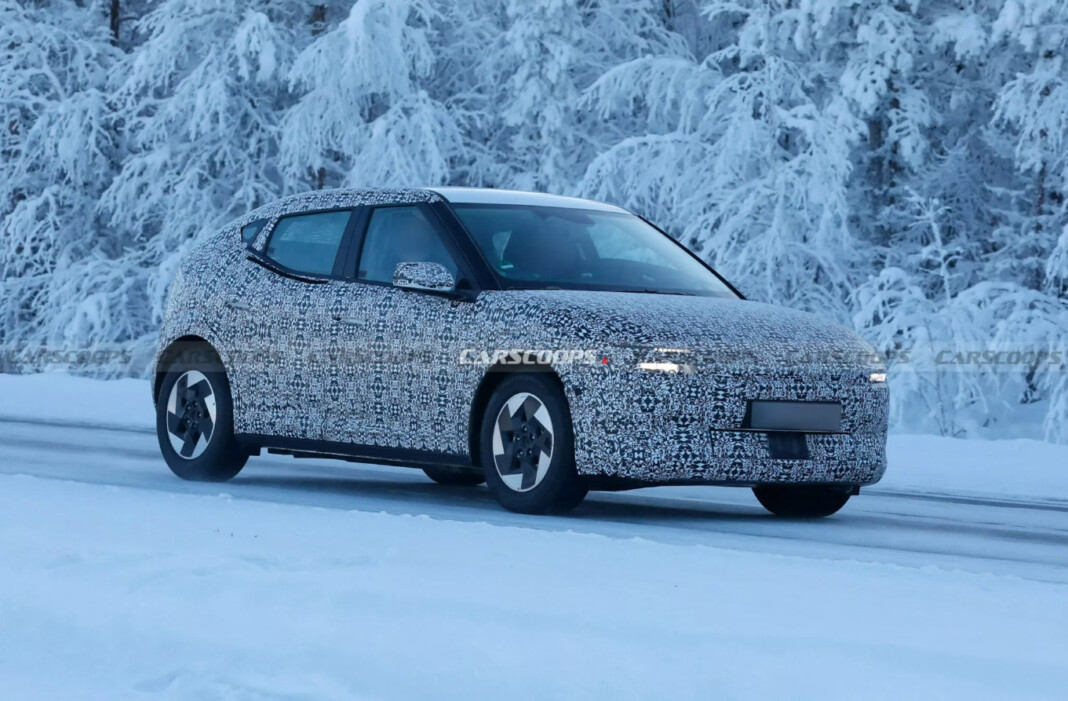 Hyundai готує до світової прем’єри компактний електромобіль Ioniq 3. Модель представлять у квітні, а поки що прототип у щільному камуфляжі помітили під час зимових тестів у Європі, пише carscoops.com.