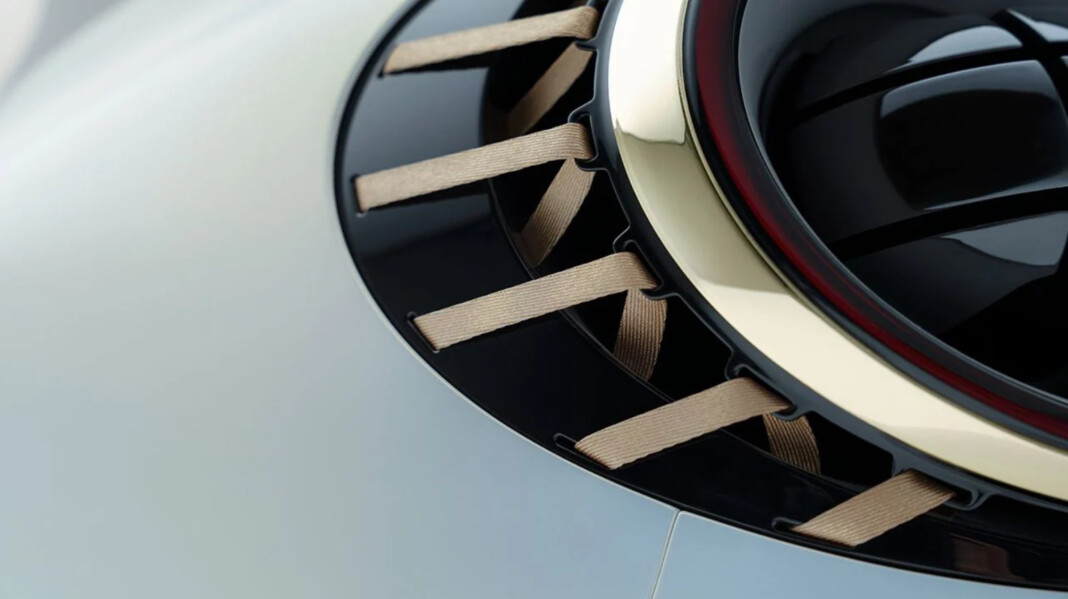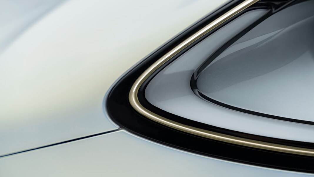 Бокова частина зберегла характерну форму захисної клітки Tridion, а колеса розташовані по краях кузова для кращої стійкості та ефективного використання простору. Також показані деталі з преміальним акцентом — матове біле покриття, золотисті вставки та декоративні елементи зі шкіри.