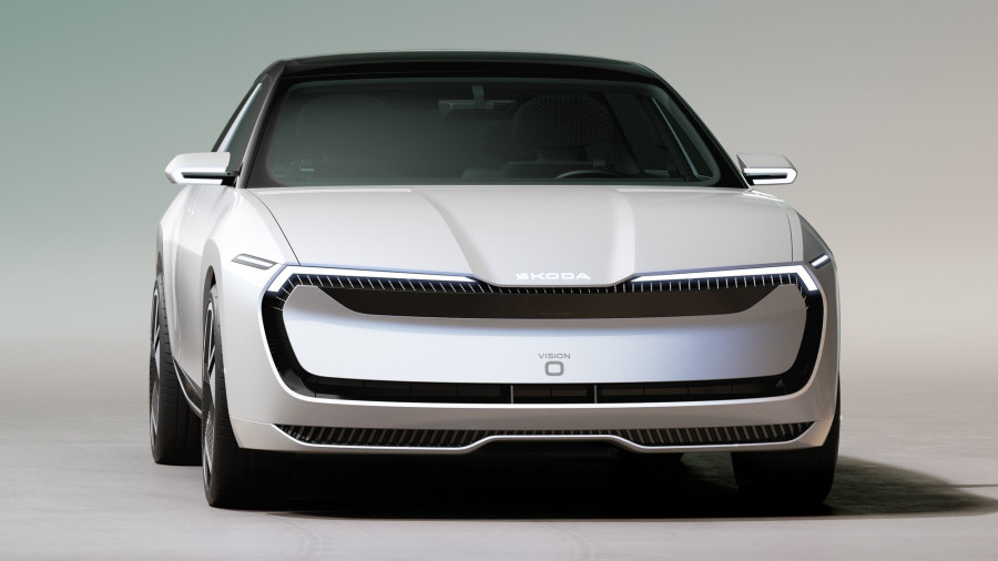 Сучасний фірмовий стиль Skoda називається Modern Solid, але в концепті Vision O ми бачимо його нове трактування — агресивніше, з елементами неокласики. Світлодіодна маска Tech-loop інтегрована у складний профіль передньої частини з виїмкою по горизонталі, через яку верх нагадує зубило. Цей ефект підкреслює й виступаюча вперед центральна кромка капота.