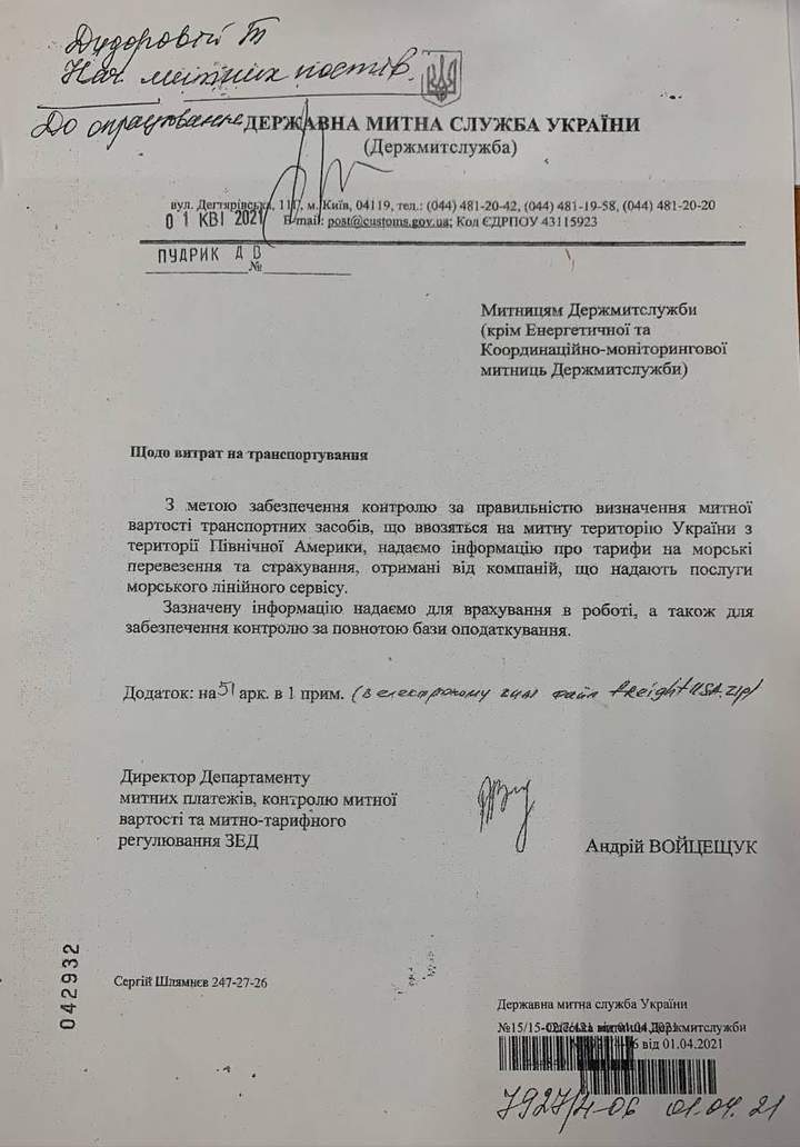Держмитслужба надіслала 1 квітня 2021 року своїм підрозділам лист “Щодо витрат на транспортування”. Він регулює визначення митної транспорті транспортних засобів, які ввозяться в Україну зі США.