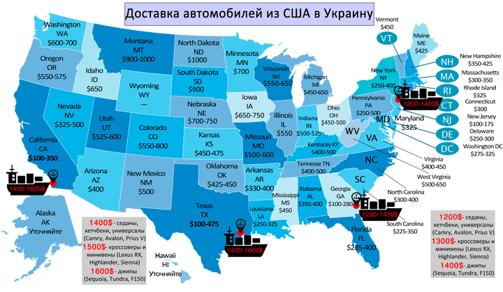 Одна з карт вартості доставки авто по США. Цей платіж митнецею до уваги не береться. А от вартість доставки морем на цій карті дещо завищена.