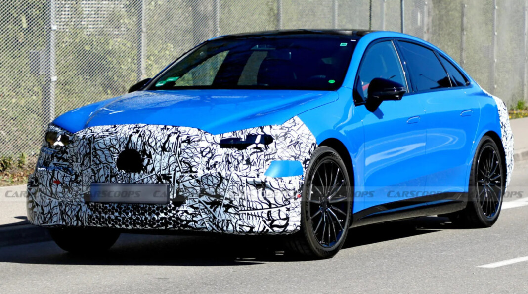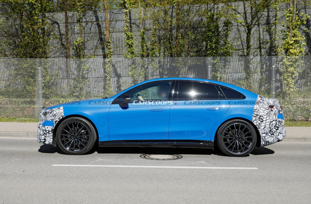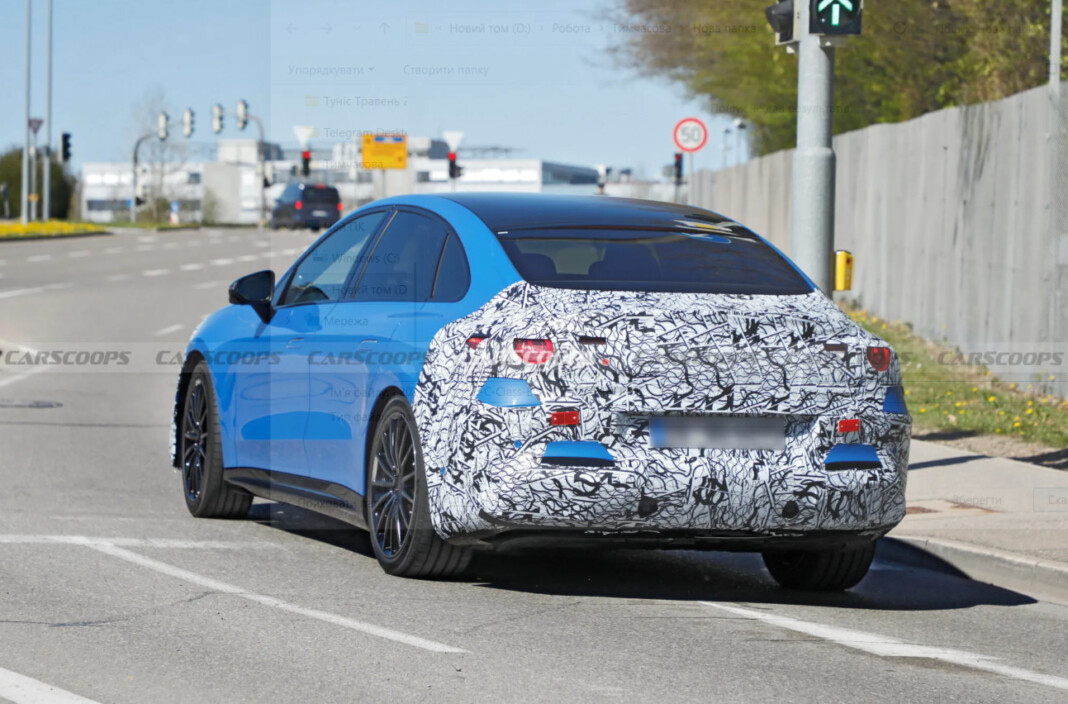 Судячи з фото, седан отримає обтічний дизайн у стилі старших електрокарів бренду. Попереду — закрита решітка з підсвіткою та фірмові фари, а силует нагадує Mercedes-Benz EQE, але виглядає більш спортивно.