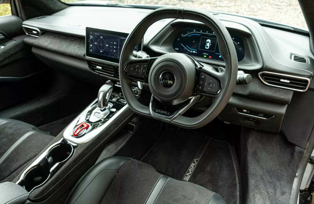 Попри вагу 1457 кг, Emira зберегла фірмову керованість. Модель оснащена гідравлічним підсилювачем керма замість електричного, що забезпечує точний зворотний зв’язок. Доступні варіанти підвіски Tour і Sport, а баланс шасі дозволяє проходити повороти на високій швидкості без втрати стабільності.