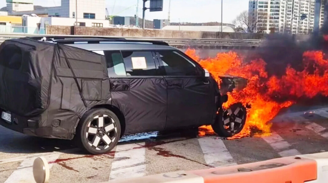 У Південній Кореї під час випробувань загорівся прототип оновленого Hyundai Santa Fe. Замаскований кросовер спалахнув неподалік заводу Hyundai в Ульсані — саме там компанія виробляє більшість своїх моделей, розповідає carscoops.com.