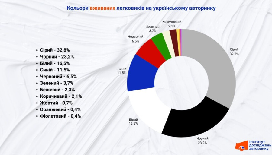 У сегменті вживаних автомобілів лідирує сірий колір з показником 32,8%. Друге місце займає чорний – 23,2%, третє – білий з 16,5%. Замикають п’ятірку лідерів синій (11,5%) та червоний (6,5%) кольори. Далі йдуть зелений – 3,7%, бежевий – 2,3%, коричневий – 2,1%, жовтий – 0,7%, оранжевий та фіолетовий – по 0,4% кожен.