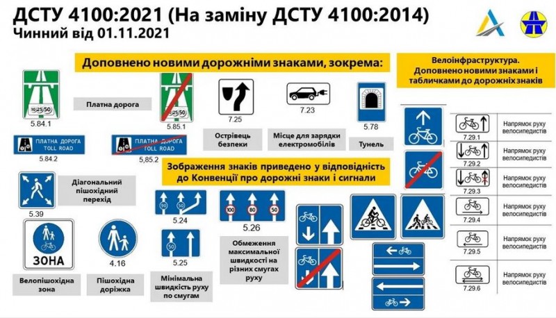 З 1 листопада на українських дорогах почнуть встановлювати знаки нового зразка. Саме тоді вступає в силу новий стандарт ДСТУ 4100: 2021 «Безпека дорожнього руху. Знаки дорожні. Загальні технічні умови. Правила застосування».