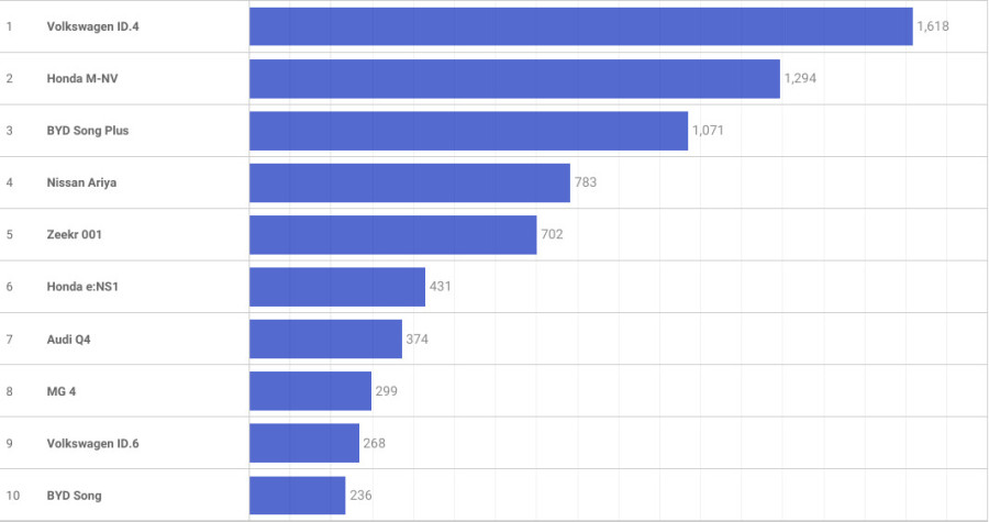 Маркою-лідером стала компанія Volkswagen з охопленням 19,1% ринку та 1973 електроавто. Трохи відстав від німецького виробника BYD з показником 1969 машин. Замикає топ-3 японська Honda з показником 1799 електромобілів.