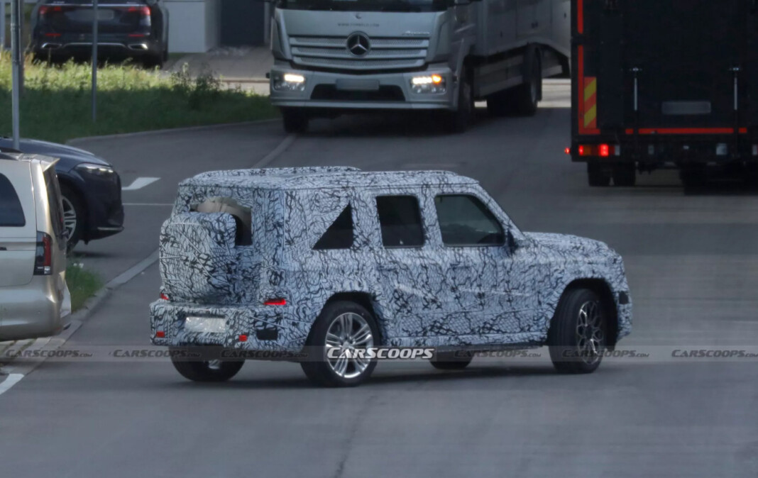 Колісна база у «малого» G-Class коротша, через що задні двері виглядають дуже компактними. Очікувати багато простору для пасажирів ззаду не варто. Замість зовнішнього запасного колеса ззаду розмістили плоский квадратний бокс, імовірно для зарядних кабелів — адже модель готують саме як електромобіль.